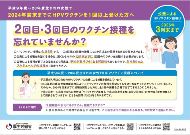 平成9年度生まれ~平成20年度生まれの女性で2020年4月~2025年3月末までにHPVワクチンを1回以上接種した方が、公費による接種を希望する場合は、2026年3月末までに2回目、3回目のワクチンを接種することをご検討ください。